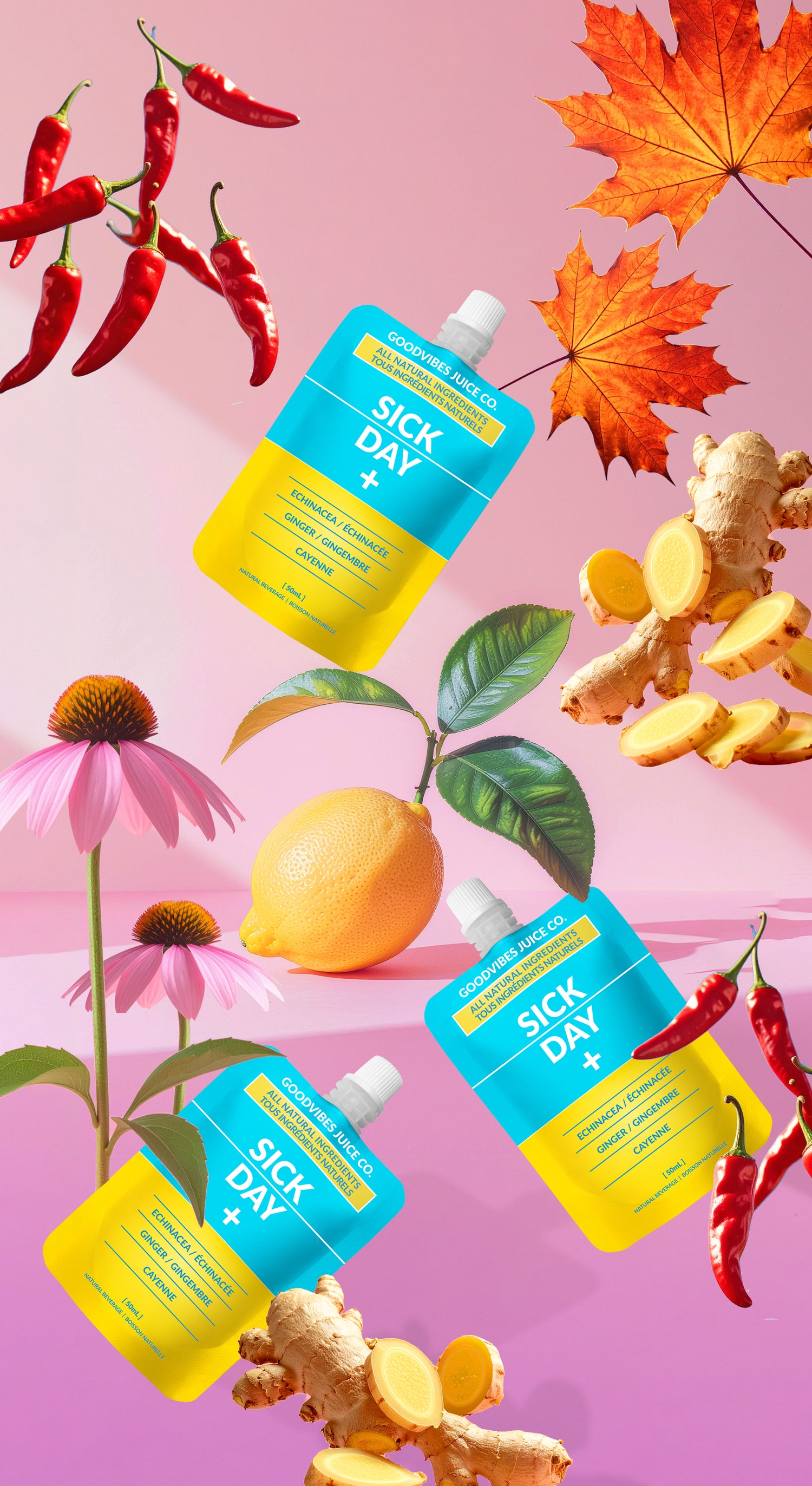 Sick Day is a concentrated 50 mL wellness shot designed to be your natural defense when you start feeling run down. Made with only five clean ingredients echinacea, ginger, lemon, cayenne, and maple it delivers fast, effective immune and wellness support without any fillers. Each pouch contains two servings, giving your body the extra support it needs, right when you need it most.